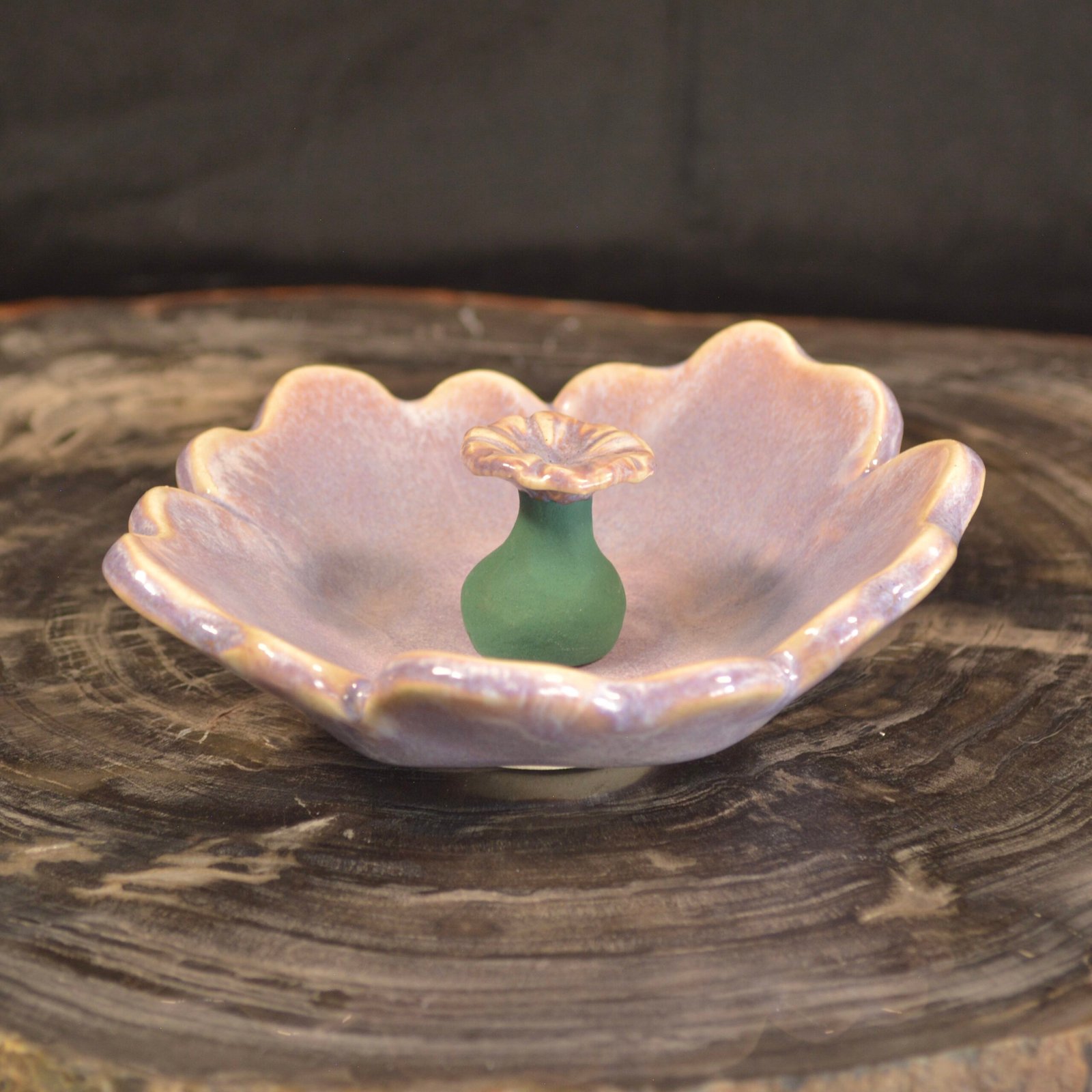 The 5 petal flower holder blends beauty and function in a five-petal floral design crafted from stoneware. Its soft lavender glaze carries hints of iridescent sheen, shifting gently in the light. The removable flower centerpiece attaches with hidden magnets and is drilled to hold an incense stick, allowing it to serve both as an incense burner and a candle holder.