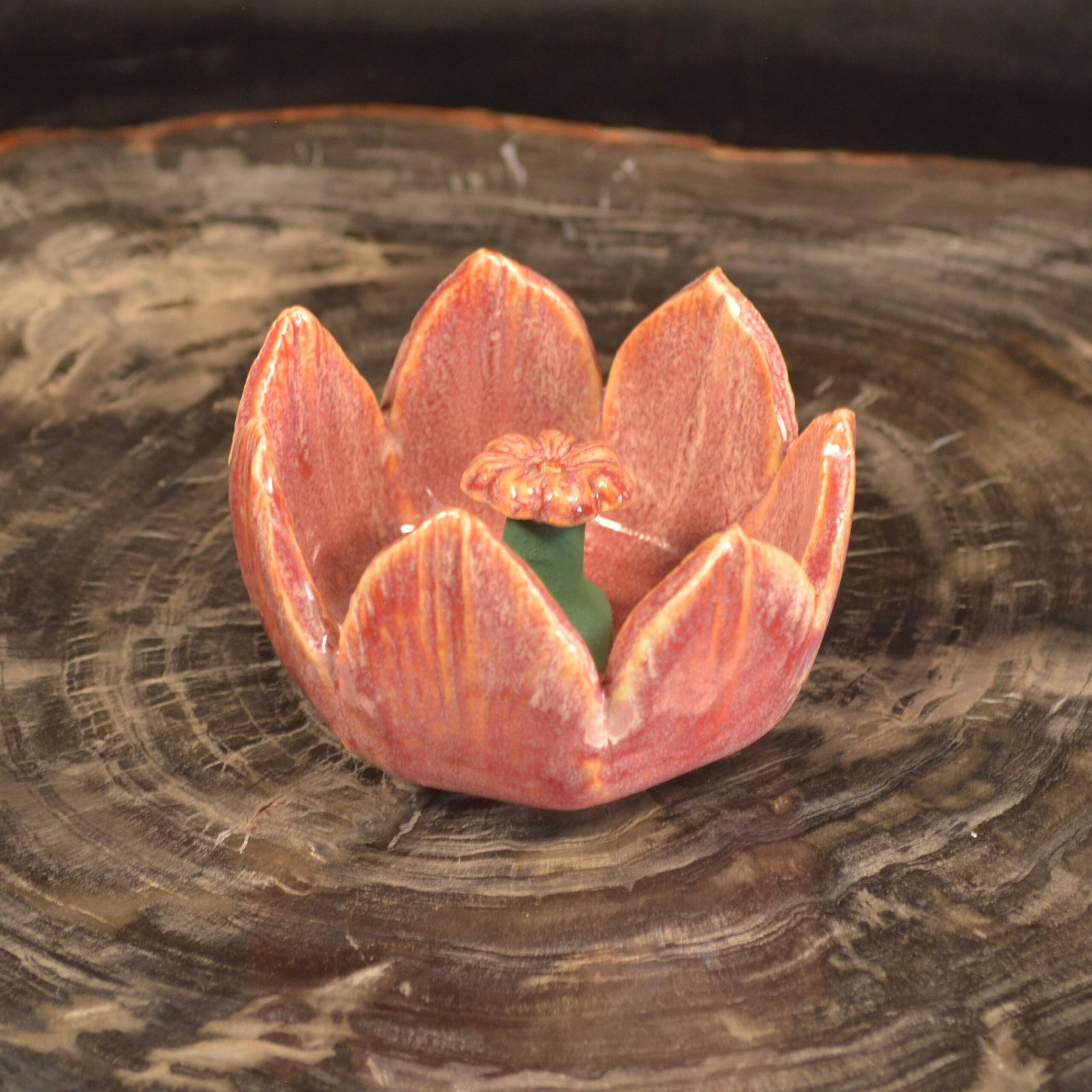 The 7 petal flower holder radiates warmth and vitality, sculpted in a seven-petal design that rises like a flame from stone. Its glaze glows with shades of ember red and golden highlights, creating a piece that feels both alive and ancient. The removable flower centerpiece connects with hidden magnets and is drilled to hold an incense stick, allowing it to function as both a candle holder and an incense burner.