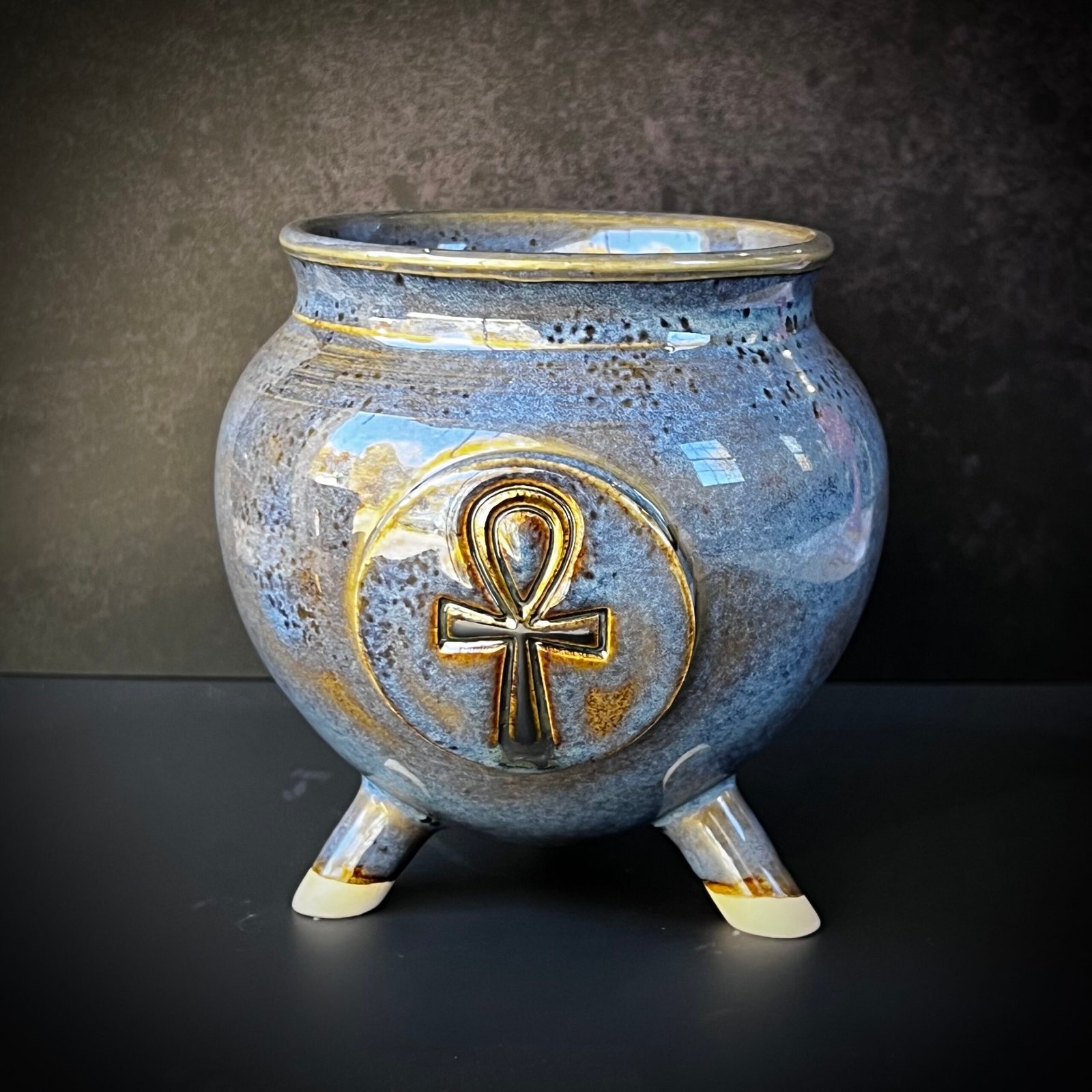 The Ankh Cauldron carries the quiet strength of the Egyptian life symbol, balance between spirit and matter, mortality and eternity. Its surface blends soft tones of gray-blue and burnished bronze, while the metallic ankh reflects light like forged silver under twilight.