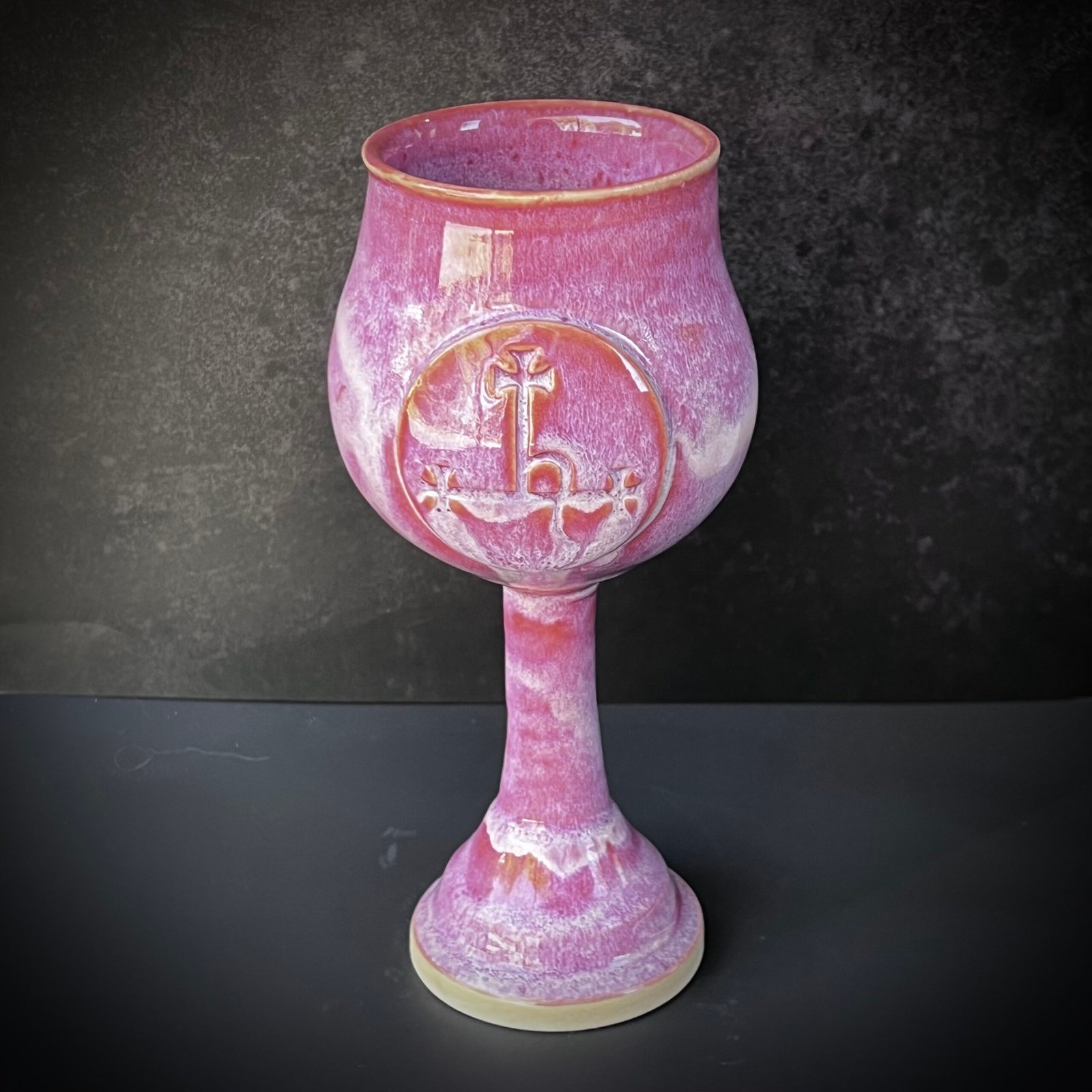 Each chalice is shaped by hand from stoneware and fired to reveal its own subtle variations in color and texture. Measuring approximately 7.25 inches tall and 3.5 inches wide, it holds about 12 ounces. Food safe and dishwasher safe, this vessel is crafted to serve in both ritual and daily use.