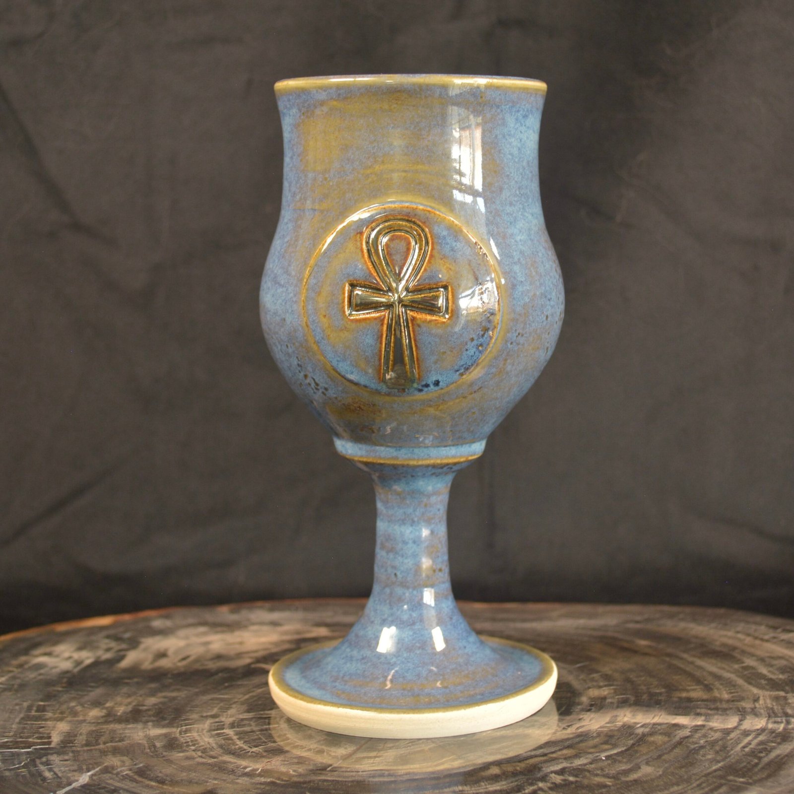 A hand-thrown stoneware chalice featuring the Egyptian Ankh, glazed in soft blue tones with a silvery finish on the symbol. Measures approximately 7.25 inches tall and 3.5 inches wide, holding about 12 ounces. Food safe and dishwasher safe.