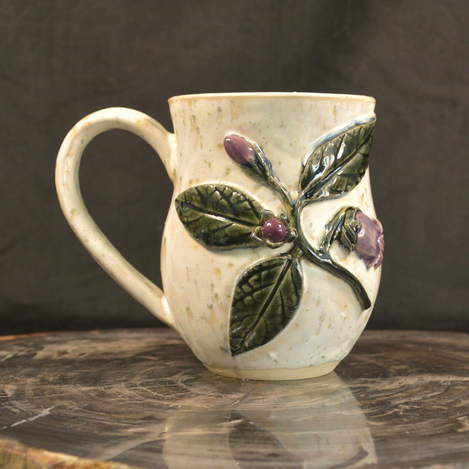 A handcrafted stoneware mug featuring sculpted belladonna blossoms, berries, and leaves in raised detail along the side. The exterior glaze is a soft, speckled cream that highlights the deep green leaves and purple blossoms. The interior is finished in the same rich purple as the berry, tying the whole piece together.