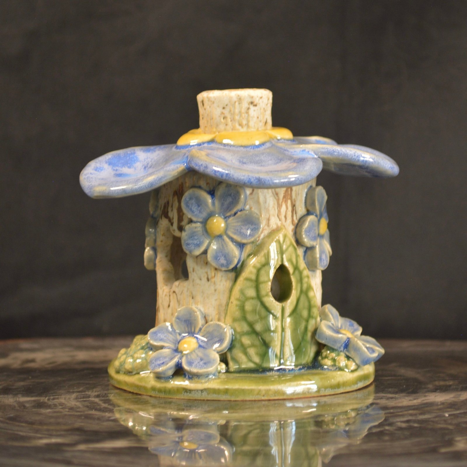 Hand built from stoneware and finished in layered blues and greens, this dual-purpose burner holds both a t-light candle and cone incense. Its petaled roof and carved leaf door evoke the quiet magick of forest spirits and hidden places.