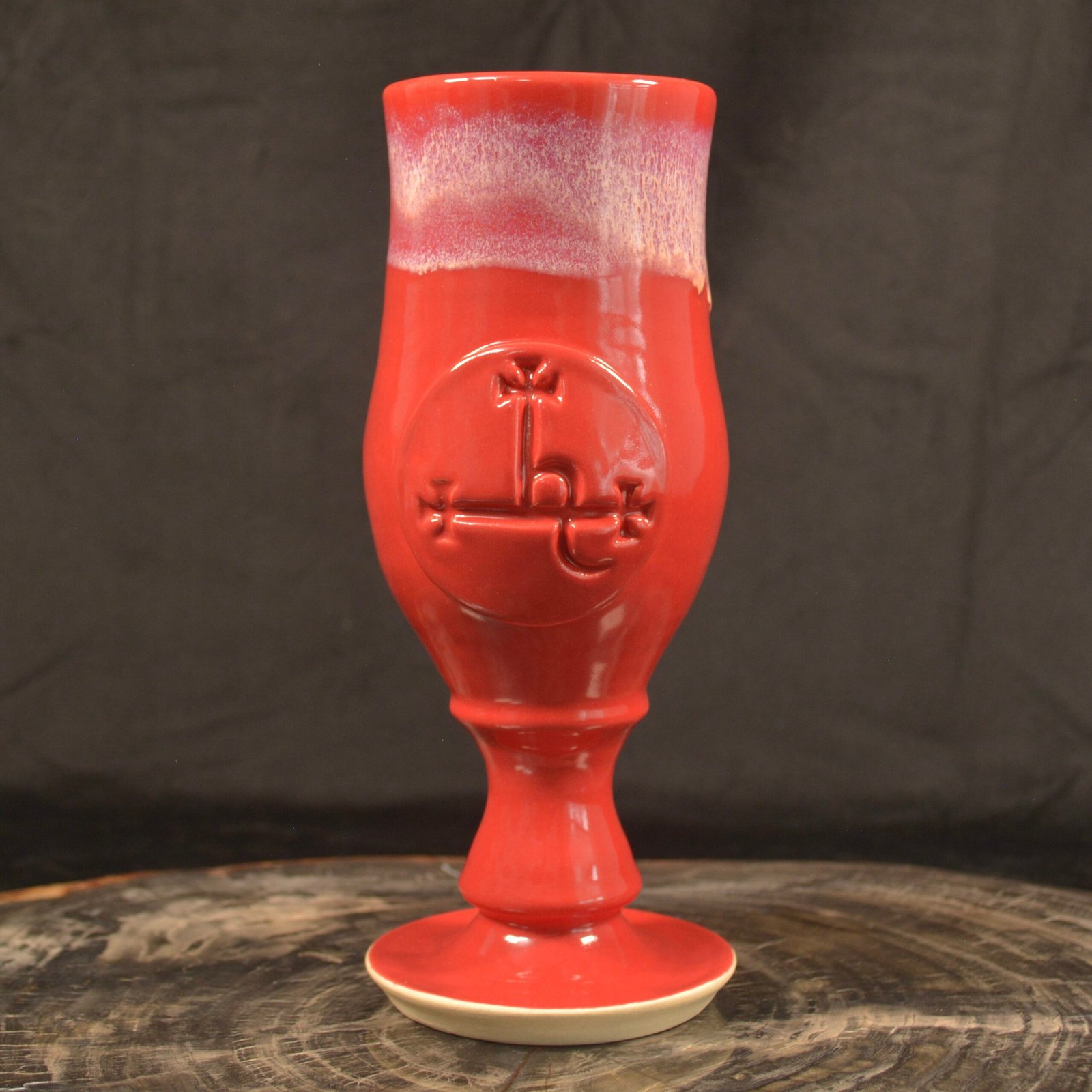 A tall, elegant stoneware chalice shaped with smooth curves and a confident presence. Glazed in a vibrant candy-apple red with a soft frothy white rim, it carries the embossed sigil of Lilith on the front.