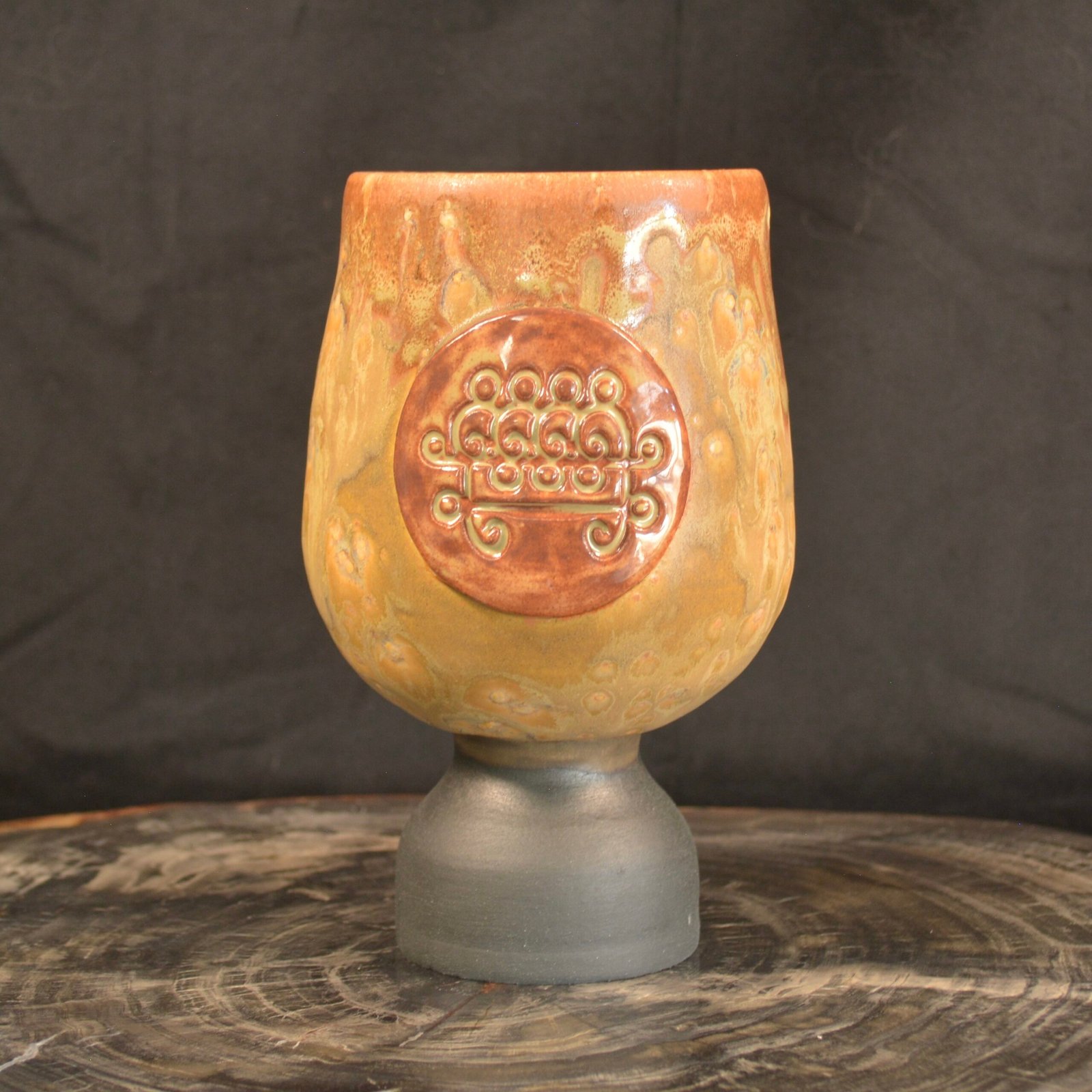 Holding 16 ounces, this piece has a tall, sturdy pedestal base in matte charcoal, giving it a grounded contrast against the warm upper colors. Smooth, balanced, and substantial in the hand — ideal for ritual offerings, display, or daily use.