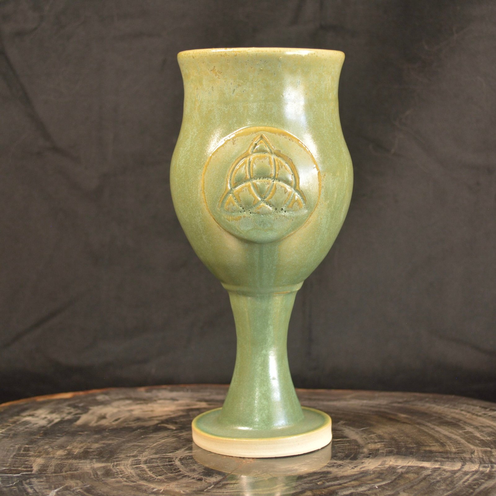 This Triquetra Chalice carries the energy of balance and renewal. The glaze shifts through gentle tones of green touched with light gold, giving it the look of moss and morning sun. The carved Triquetra rests at its heart, a symbol of connection between body, mind, and spirit.